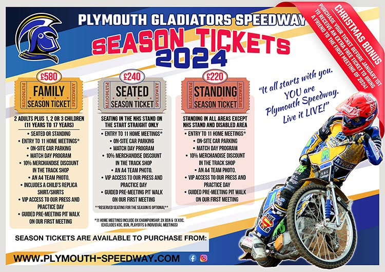 Plymouth Gladiators 2024 season tickets are now available via the official online ticket store.